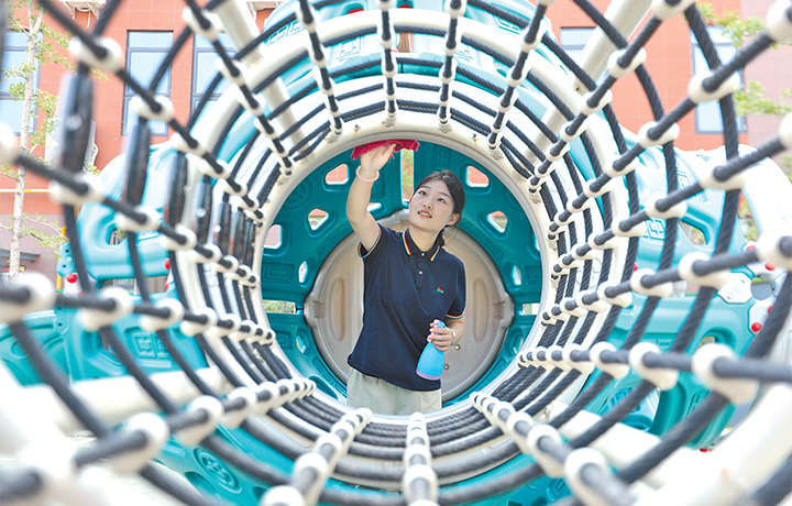 8月30日,在愚公路幼兒園,老師正對戶外器材進(jìn)行清掃、消毒。