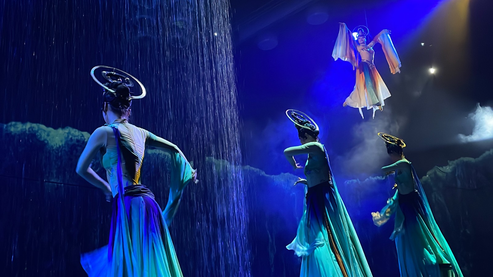 “在演出現(xiàn)場,我們沒有設(shè)置傳統(tǒng)的觀影座位。游客可以在場景內(nèi)走動,跟隨演員‘穿越’到不同時空中,感受洛陽歷史文化的魅力?!甭尻柎蠛铀C市場營銷部策劃主管李小雪介紹,《尋跡洛神賦》包含“源起·河圖洛書”、“詠頌·洛神賦”、“傳頌·龍門世遺”、“重現(xiàn)·文武昌盛”、“融薈·洛水物華”五大篇章,自5月正式公演以來,受到了游客們的一致好評。