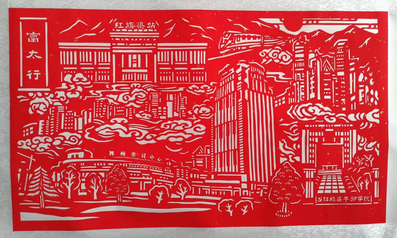 紅旗渠精神是林州的立市之本、興市之魂。林州的發(fā)展歷程,以20世紀(jì)60年代修建紅旗渠、80年代外出發(fā)展建筑業(yè)、90年代大辦鄉(xiāng)鎮(zhèn)企業(yè)和市屬工業(yè)、十八大以來加強(qiáng)生態(tài)建設(shè)為標(biāo)志,經(jīng)歷了“戰(zhàn)太行、出太行、富太行、美太行”四個階段,被人們形象地稱為林州人的“創(chuàng)業(yè)四部曲”。剪紙作品《富太行》通過林州實(shí)施城建創(chuàng)精品戰(zhàn)略,建設(shè)林州市民中心、林州建筑大廈、紅旗渠干部學(xué)院、紅旗渠火車站等一批城市地標(biāo)性建筑,展現(xiàn)了林州人民的美好生活。