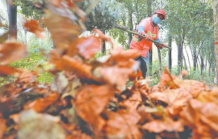 11月4日,環(huán)衛(wèi)工人在玉川街清掃落葉。