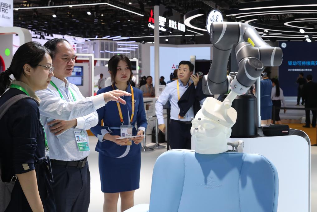 11月5日,參觀者在第六屆進博會歐姆龍公司展出的黑海豚靶向磁刺激機器人展品旁交流。新華社記者 方喆 攝