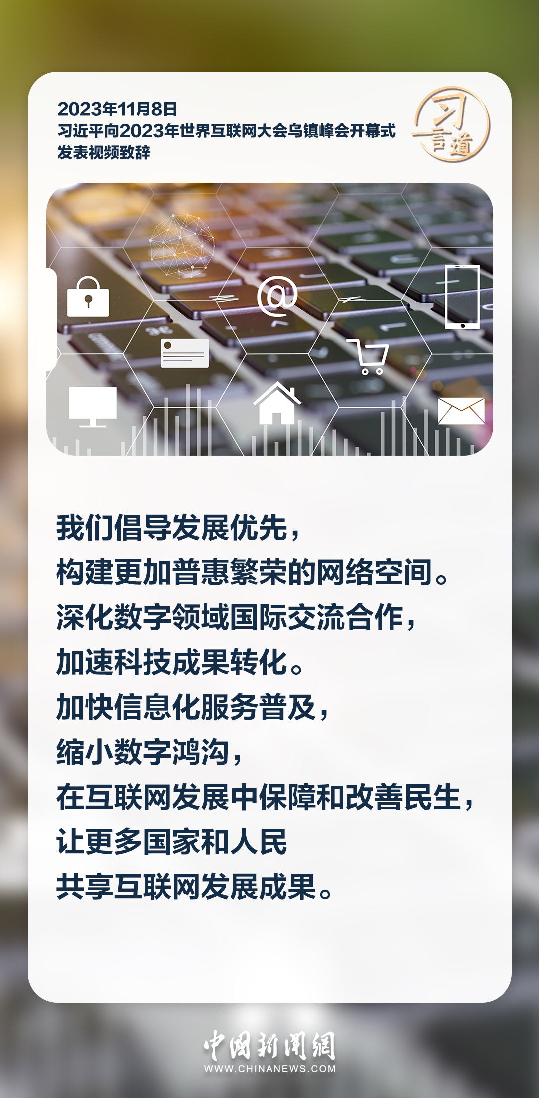 11月8日上午,國(guó)家主席習(xí)近平向2023年世界互聯(lián)網(wǎng)大會(huì)烏鎮(zhèn)峰會(huì)開幕式發(fā)表視頻致辭。習(xí)近平指出——