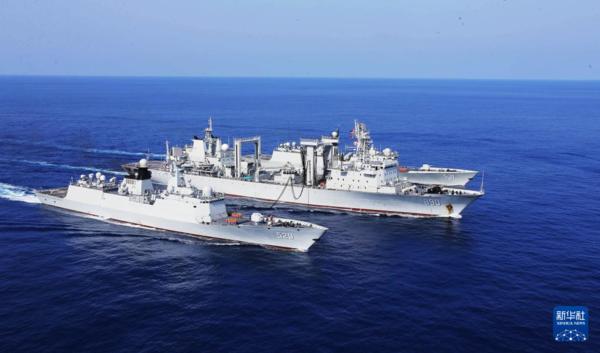 中國海軍第23批護航編隊艦艇進行航行補給(2016年4月25日攝)。新華社發(fā)(錢宏 攝)