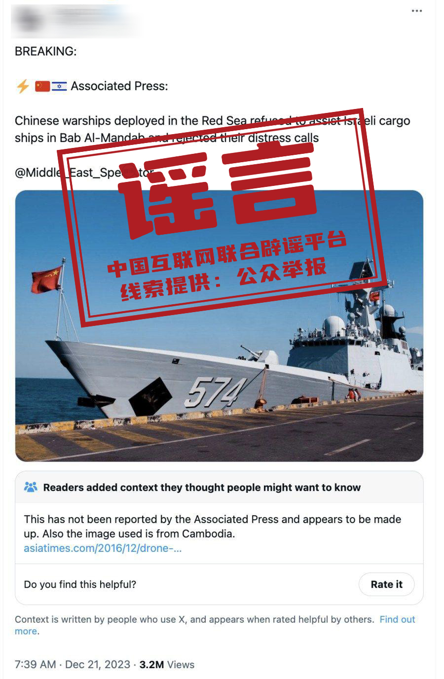 真相:針對(duì)“一艘以色列商船向中國(guó)海軍烏魯木齊艦進(jìn)行求助遭到拒絕”的報(bào)道,國(guó)防部新聞發(fā)言人吳謙在12月28日的例行記者會(huì)上回應(yīng),這是徹頭徹尾的假消息。另?yè)?jù)新華社25日?qǐng)?bào)道,一個(gè)有十多萬(wàn)“粉絲”的境外社交平臺(tái)賬號(hào)以美聯(lián)社為“信源”發(fā)帖稱,“中國(guó)軍艦在曼德海峽拒絕協(xié)助以色列貨船,且無(wú)視他們的呼救?!边@一謠言隨即被多個(gè)權(quán)威信源辟謠。事實(shí)上,美聯(lián)社根本沒有這則報(bào)道。(來(lái)源:中華人民共和國(guó)國(guó)防部、新華社)