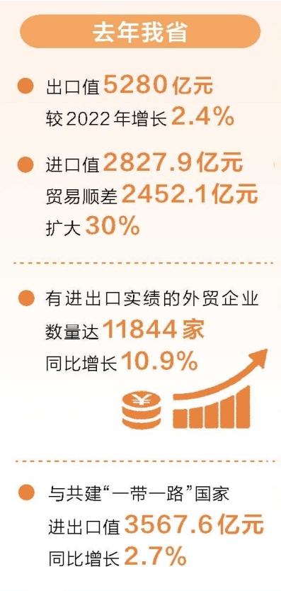 2023年,面對復雜的外部環(huán)境,我省堅持穩(wěn)中求進工作總基調(diào),堅定不移推動高質(zhì)量發(fā)展,外貿(mào)發(fā)展表現(xiàn)出較強的韌性和抗壓能力,穩(wěn)住了基本盤。數(shù)據(jù)顯示,去年我省出口值5280億元,較2022年增長2.4%;進口值2827.9億元,貿(mào)易順差2452.1億元,擴大30%。從全年外貿(mào)走勢來看,第三、第四季度外貿(mào)總值環(huán)比持續(xù)增長,且增幅持續(xù)擴大,其中第四季度環(huán)比大幅增長23.2%。