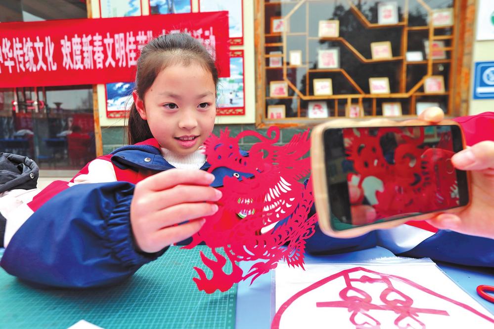 1月30日,健康路小學(xué)學(xué)生在展示剪紙作品。