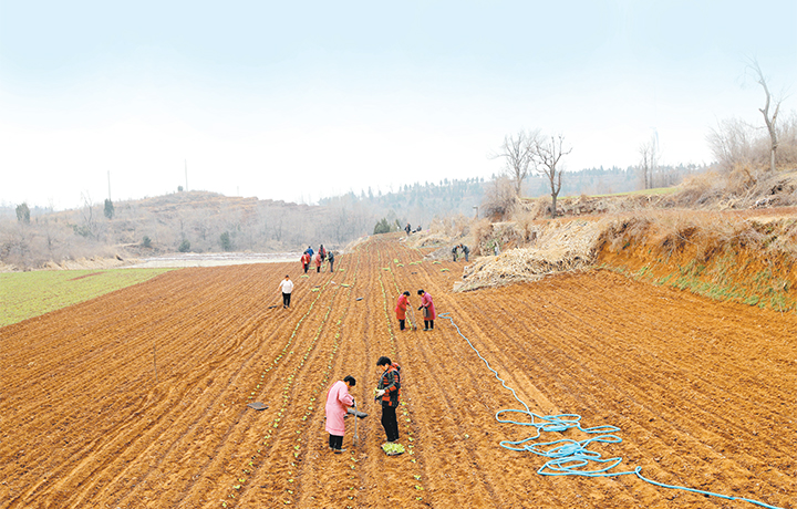 2月28日,大峪鎮(zhèn)栗園村,農(nóng)民在田間種植白菜苗。