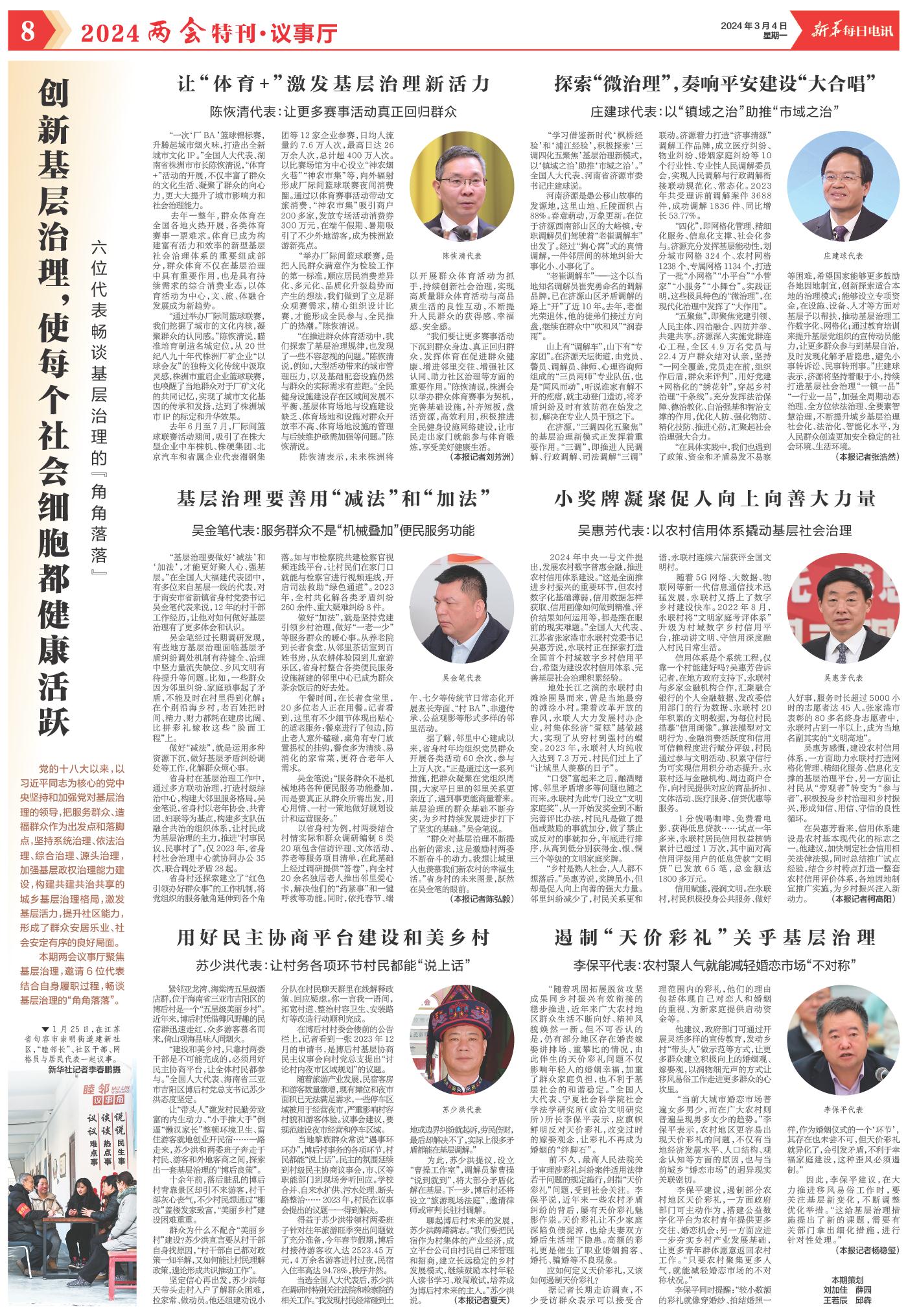 “在具體實(shí)踐中,我們也遇到了政策、資金和矛盾易發(fā)不易察等困難,希望國家能夠更多鼓勵(lì)各地因地制宜,創(chuàng)新探索適合本地的治理模式;能夠設(shè)立專項(xiàng)資金,在設(shè)施、設(shè)備、人才等方面對(duì)基層予以幫扶,推動(dòng)基層治理工作數(shù)字化、網(wǎng)格化;通過教育培訓(xùn)來提升基層黨組織的宣傳動(dòng)員能力,讓更多群眾參與到基層自治,及時(shí)發(fā)現(xiàn)化解矛盾隱患,避免小事轉(zhuǎn)訴訟、民事轉(zhuǎn)刑事?!鼻f建球表示,濟(jì)源將堅(jiān)持著眼于小,持續(xù)打造基層社會(huì)治理“一鎮(zhèn)一品”“一行業(yè)一品”,加強(qiáng)全周期動(dòng)態(tài)治理、全方位依法治理、全要素智慧治理,不斷提升城鄉(xiāng)基層治理社會(huì)化、法治化、智能化水平,為人民群眾創(chuàng)造更加安全穩(wěn)定的社會(huì)環(huán)境、生活環(huán)境。