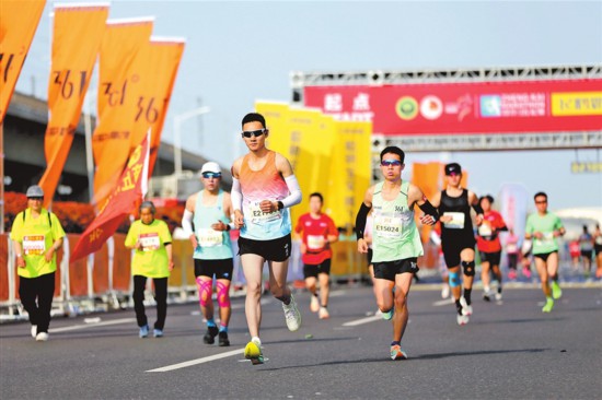 本屆賽事設(shè)置男、女全程馬拉松,男、女半程馬拉松以及5公里歡樂跑等項(xiàng)目。經(jīng)過兩個(gè)多小時(shí)角逐,全程馬拉松男子及女子冠軍分別來自埃塞俄比亞和巴林,成績分別為2小時(shí)14分06秒、2小時(shí)26分48秒。記者 鄧放 攝