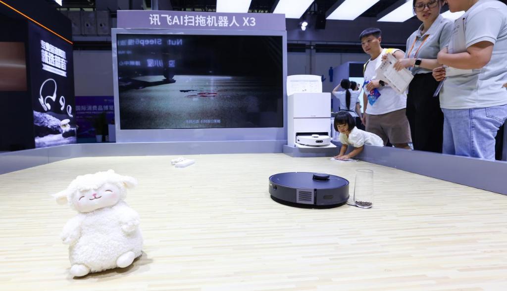 ??4月16日,在第四屆消博會科大訊飛展臺,AI掃拖機(jī)器人進(jìn)行掃拖地演示。新華社記者楊冠宇 攝