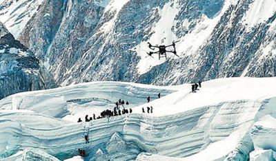 大疆運(yùn)載無人機(jī)在珠穆朗瑪峰南坡昆布冰川進(jìn)行物資運(yùn)輸測試。新華社發(fā)