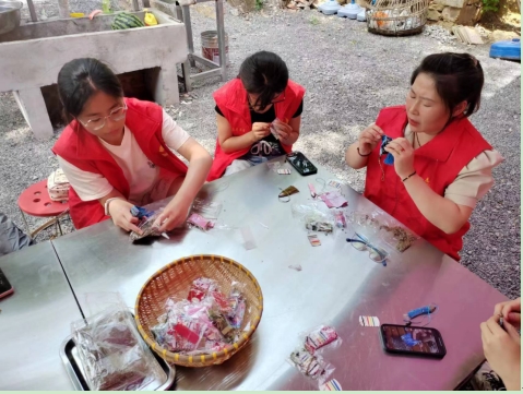 承留鎮(zhèn)孤樹村舉辦“香約端午 粽享快樂”文化活動。圖為文化志愿者在制作端午香囊。