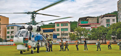 6月17日,廣東省梅州市平遠(yuǎn)縣體育場(chǎng),直升機(jī)在運(yùn)送救援物資。