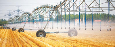 6月17日,在山東省東營(yíng)市廣饒縣李鵲鎮(zhèn)前艾家村的田地里,農(nóng)民正在使用桁架式噴灌機(jī)澆地。