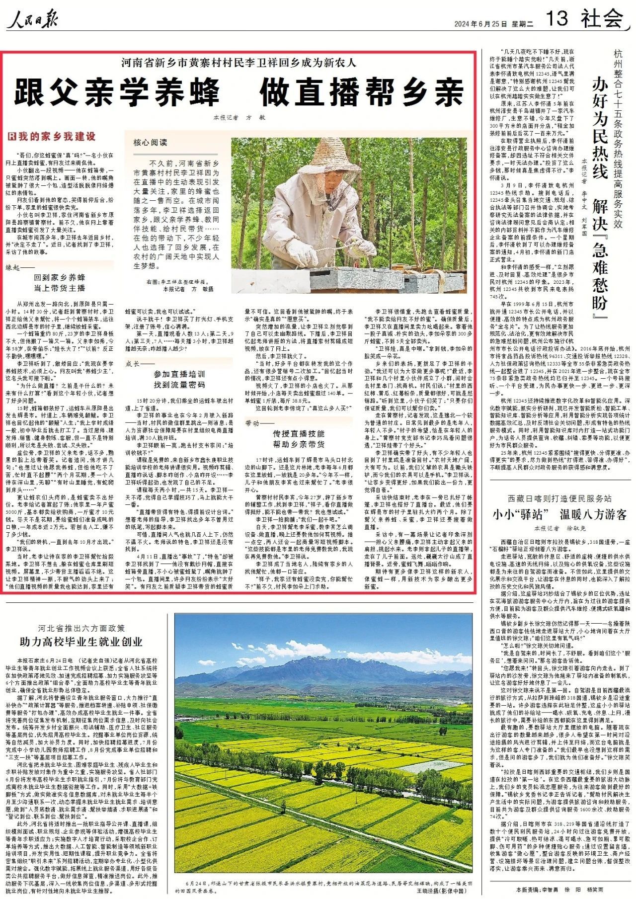 不久前,河南省新鄉(xiāng)市黃寨村村民李衛(wèi)祥因為在直播中的生動表現(xiàn)引發(fā)大量關注,家里的蜂蜜也隨之一售而空。在城市闖蕩多年,李衛(wèi)祥選擇返回家鄉(xiāng),跟父親學養(yǎng)蜂、教同伴技能、給村民帶貨……在他的帶動下,不少年輕人也選擇了回鄉(xiāng)發(fā)展,在農村的廣闊天地中實現(xiàn)人生夢想。