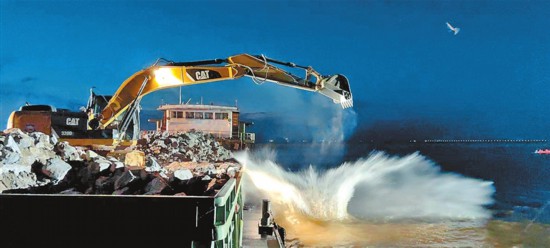 最危險(xiǎn)的還數(shù)船舶水上拋投作業(yè)。為提升效率,挖掘機(jī)、推土機(jī)要直接開上裝運(yùn)石料的船舶,將石料投入決口處。水流沖擊下的船舶搖晃不止,大型機(jī)械重心高,需要精準(zhǔn)的操作才能安全無誤地完成任務(wù)。急難險(xiǎn)重任務(wù)前,來自鶴壁基地的李磊、陳果、沙偉政搶著往前沖?!拔覀兇淼氖羌w榮譽(yù),也是對自身技術(shù)的自信?!比吮硎?。