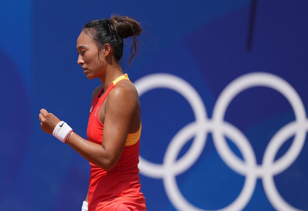 7月30日,鄭欽文在比賽中慶祝得分。當(dāng)日,在巴黎奧運(yùn)會網(wǎng)球女子單打第三輪比賽中,中國選手鄭欽文2:1戰(zhàn)勝美國選手納瓦羅,晉級八強(qiáng)。新華社記者 萬象 攝