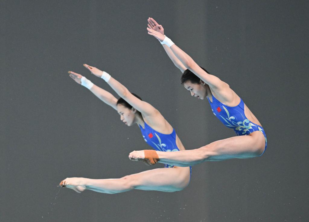 4月19日,全紅嬋/陳芋汐(左)在2024年跳水世界杯總決賽女子雙人10米臺決賽中。新華社記者 張博文 攝