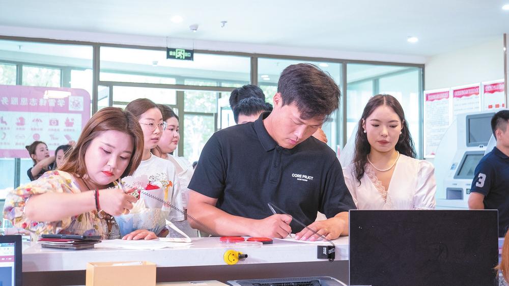 當(dāng)天一大早,記者在示范區(qū)民政局婚姻登記處大廳看到,前來登記結(jié)婚的新人有序排隊等候。他們在工作人員的引導(dǎo)下,填寫、遞交資料,領(lǐng)取結(jié)婚證,并合影留念。