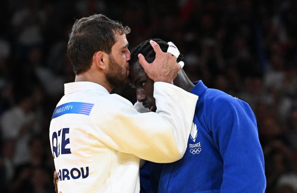 ??精疲力盡的兩人在賽后緊緊相擁,贏得金牌的海達羅夫親吻了本杰明的額頭,表示敬意。
