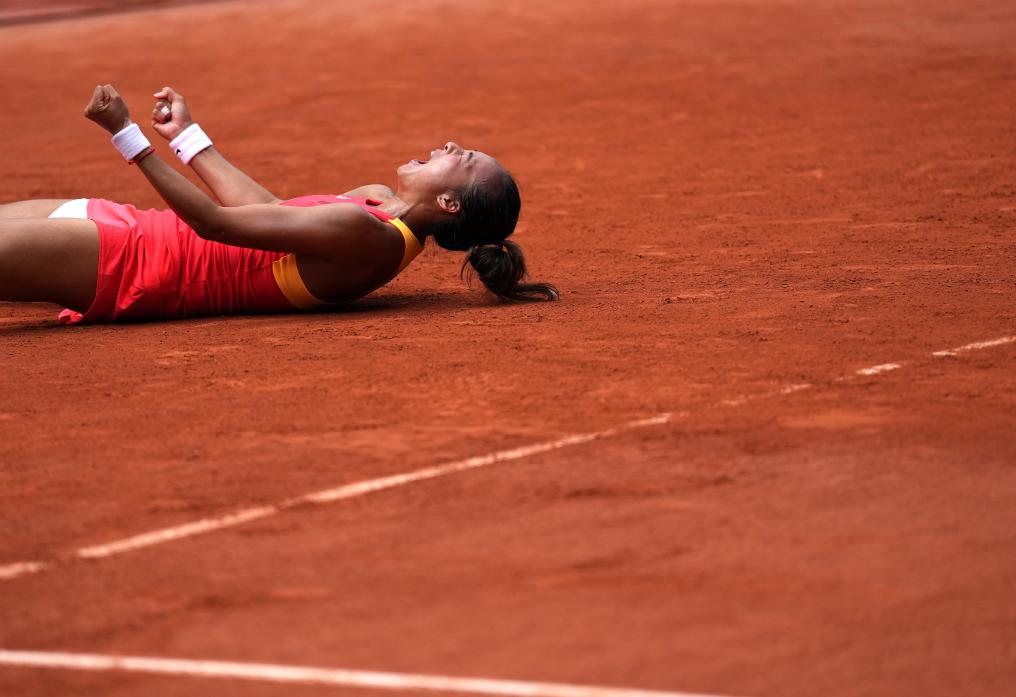 ??中國選手鄭欽文慶祝勝利。新華社記者 萬象 攝