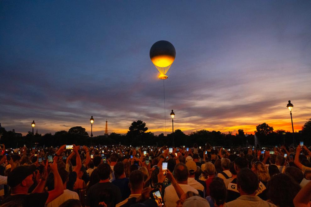 ??歷史建筑與現(xiàn)代藝術(shù)的融合彰顯法式浪漫。埃菲爾鐵塔上的燈光秀劃破夜空。特羅卡德羅廣場上,神秘人將火炬交給法國傳奇球星齊達內(nèi),不久后,杜樂麗花園內(nèi)的主火炬——一個直徑7米的火焰環(huán),頂部是一個高30米、直徑22米的系留氣球,被“點燃”。