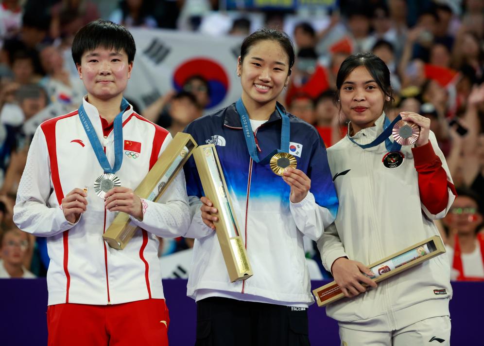 ??8月5日,亞軍中國選手何冰嬌(左)手持一枚西班牙奧委會徽章登上巴黎奧運會羽毛球項目女單領(lǐng)獎臺。新華社記者 任正來 攝