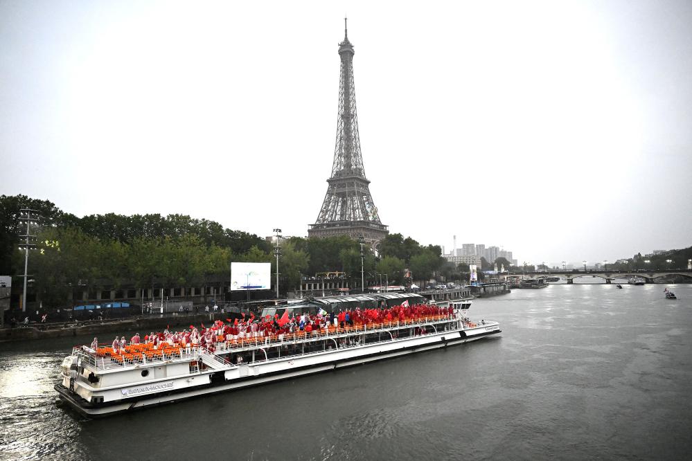 ??7月26日,中國體育代表團乘坐的船只行駛在塞納河上,遠(yuǎn)處是埃菲爾鐵塔。新華社記者 李安 攝