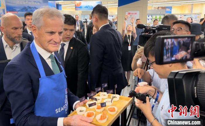 10日晚間,挪威首相斯特勒現(xiàn)身上海東虹橋中心,在簡(jiǎn)單參觀后,便穿上藍(lán)色圍裙,現(xiàn)場(chǎng)“帶貨”自家海產(chǎn)品。他端著餐盤,一邊邀請(qǐng)大家品嘗挪威三文魚和青花魚,一邊介紹道:“快試試,很新鮮?!?/p>