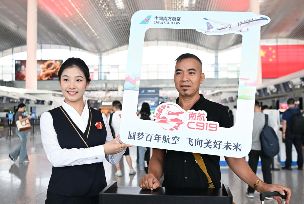 9月19日,在廣州白云機場航站樓,旅客打卡拍照紀念南航C919首航。新華社記者 鄧華 攝