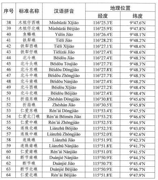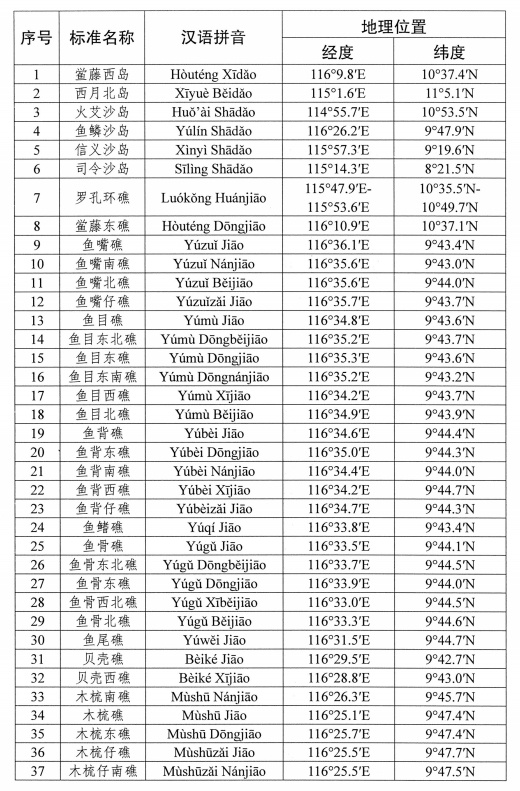 為進(jìn)一步規(guī)范有關(guān)地名的使用,自然資源部、民政部公布我國(guó)南海部分島礁標(biāo)準(zhǔn)名稱(chēng)。中國(guó)地名委員會(huì)1983年4月受權(quán)公布的《我國(guó)南海諸島部分標(biāo)準(zhǔn)地名》和自然資源部、民政部2020年4月公布的《自然資源部 民政部關(guān)于公布我國(guó)南海部分島礁和海底地理實(shí)體標(biāo)準(zhǔn)名稱(chēng)的公告》繼續(xù)有效,請(qǐng)社會(huì)各界規(guī)范使用已公布的標(biāo)準(zhǔn)名稱(chēng)。