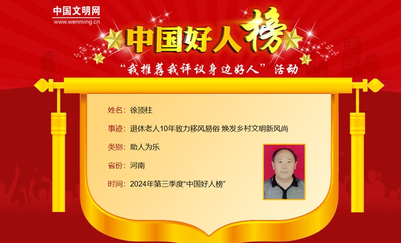 徐頂柱上榜2024年第三季度“中國好人榜”。