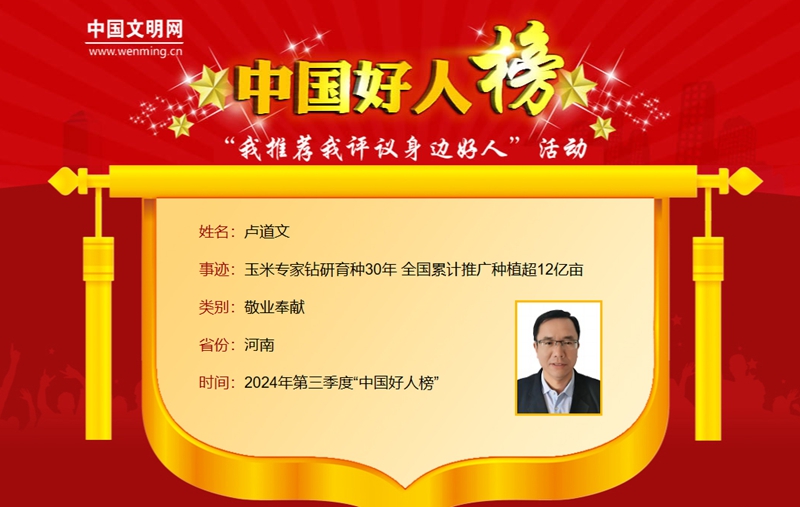 盧道文上榜2024年第三季度“中國好人榜”。