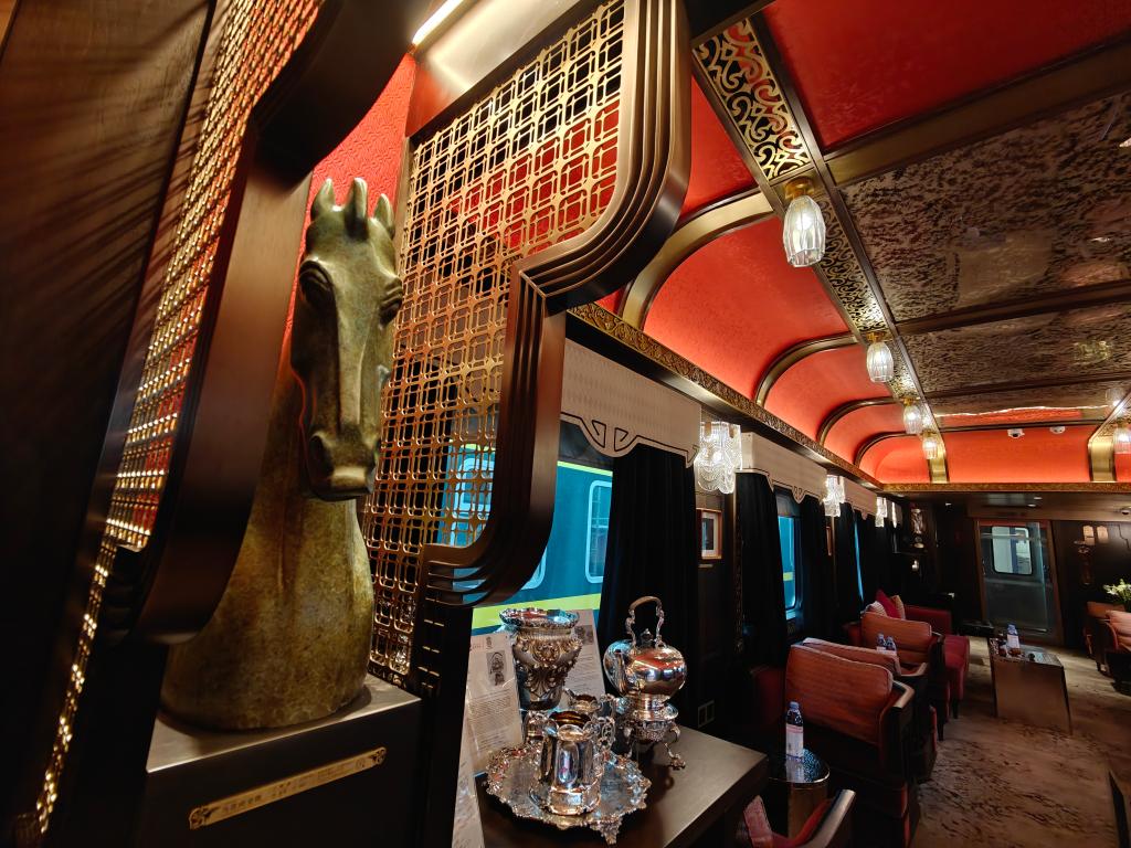 這些旅游列車有著獨具特色的車身外觀,有的以敦煌壁畫元素為紋理,有的以憨態(tài)可掬的熊貓為主題;有著舒適的會客廳、超大景觀車窗、超靜音設(shè)計包房、智能家居系統(tǒng)、各地文創(chuàng)美食……旅游列車仿佛鐵軌上的“星級酒店”,滿足中外游客對高品質(zhì)旅行的需求。