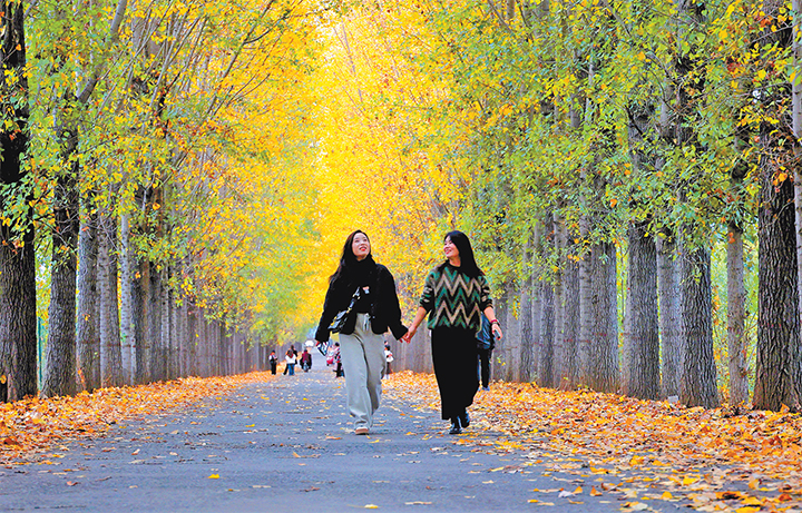 11月16日,在思禮鎮(zhèn)立城村,初冬的林道美景吸引眾多市民前來打卡。