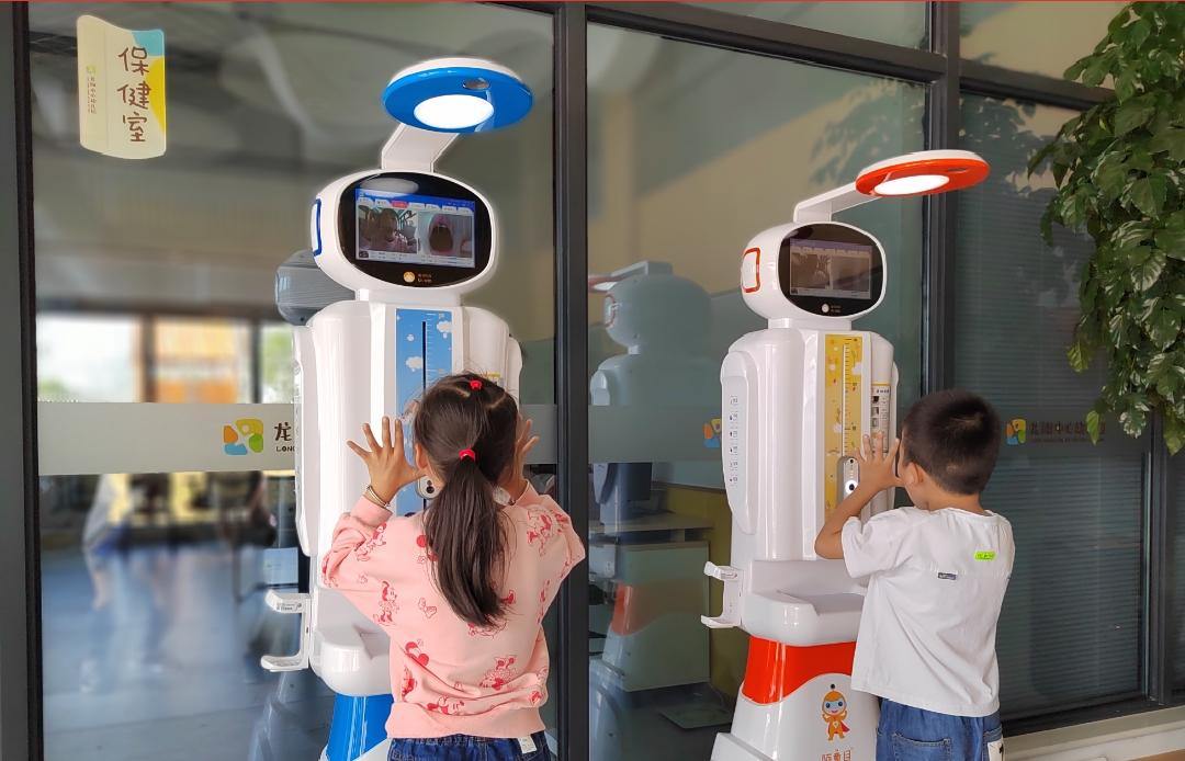 清晨,在烏鎮(zhèn)首個(gè)智慧化幼兒園——烏鎮(zhèn)龍翔中心幼兒園,憨態(tài)可掬的晨檢機(jī)器人代替老師與孩子們互動(dòng),并對他們進(jìn)行健康測量。