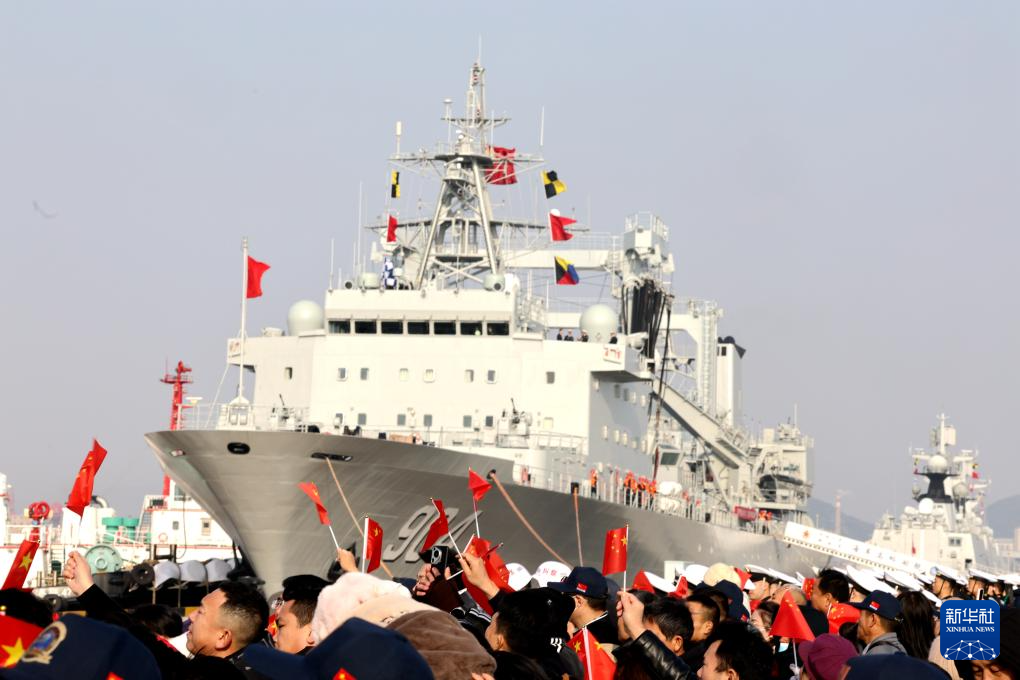 ??上午9時許,伴隨著嘹亮的軍樂聲,編隊艦艇依次解纜,緩緩駛離碼頭。甲板上,任務官兵整齊列隊,向祖國和親人揮手告別。