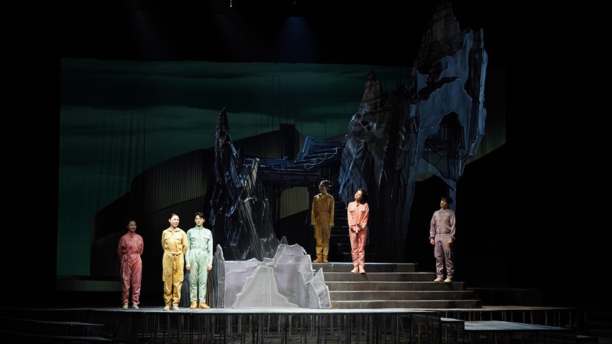 《愚公移山》故事原文一共三百一十字,整個故事簡略且缺少戲劇張力,最要緊的是這則故事家喻戶曉、婦孺皆知,可供發(fā)揮的空間有限。如何將三百余字篇幅的寓言故事搬上舞臺,擴展成近兩個小時的舞臺說唱表演?如何將大家滾瓜爛熟的故事講出新意?如何讓傳統(tǒng)文化的內(nèi)核和當代精神鏈接,引起當代人特別是當代青年人的共鳴?說唱音樂劇《愚公移山》通過一系列的“新”交出了令人滿意的答卷。