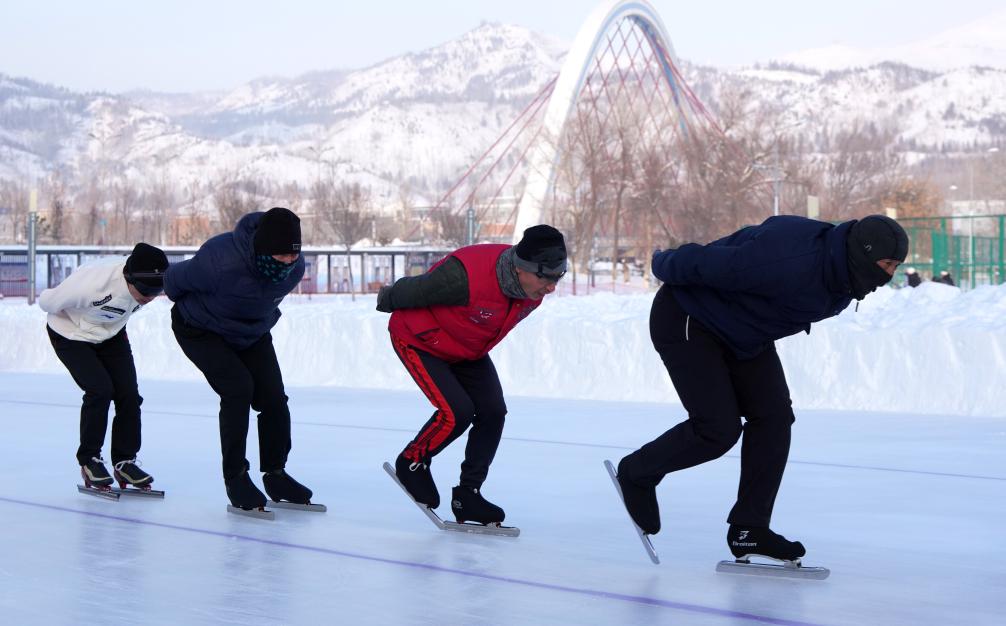 ??不一會兒,一群孩子涌入冰場,他們是阿勒泰市業(yè)余體校的小運(yùn)動員,年齡8到15歲不等。他們脫下厚重的棉衣,換上連身服,開始在冰面上滑行,在教練的指揮下,時而沖刺,時而慢行調(diào)整,輕快的腳步讓“老朋友們”贊嘆,“這些小孩厲害啊,比我們那會兒強(qiáng)多了”。