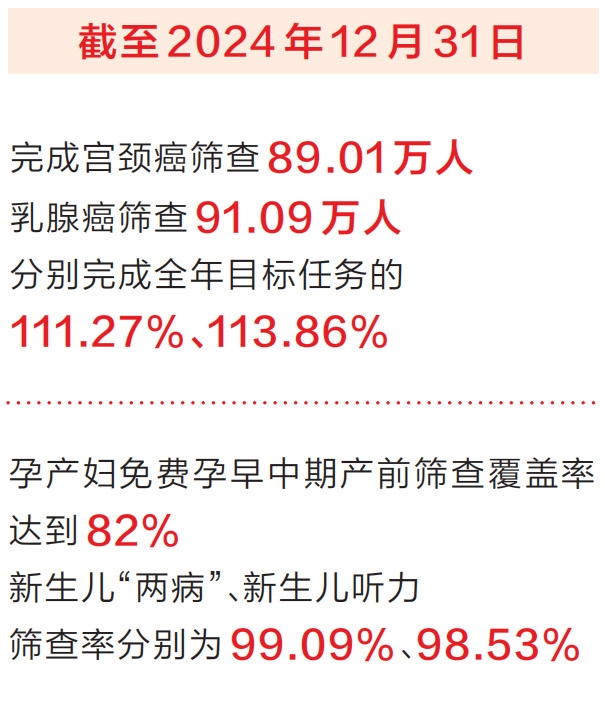 省衛(wèi)生健康委主任黃紅霞介紹,2024年,省衛(wèi)生健康委會同省財(cái)政廳、省民政廳、省婦聯(lián)、省殘聯(lián)等相關(guān)責(zé)任單位,精心組織,扎實(shí)推進(jìn),全省免費(fèi)篩查民生實(shí)事如期完成目標(biāo)任務(wù)。