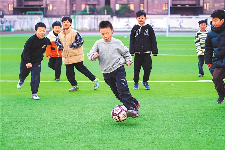 洛陽市瀍河區(qū)君河灣小學,學生們在踢足球。 李衛(wèi)超 鄧佳英 攝