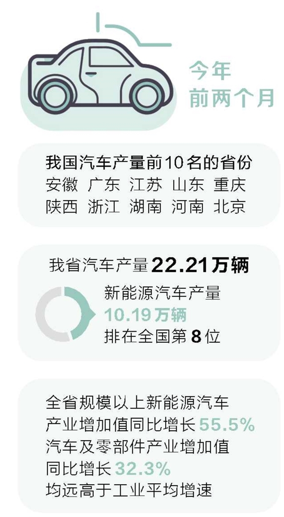 今年前兩個(gè)月,全省規(guī)模以上新能源汽車產(chǎn)業(yè)增加值同比增長55.5%,汽車及零部件產(chǎn)業(yè)增加值同比增長32.3%,均遠(yuǎn)高于工業(yè)平均增速。