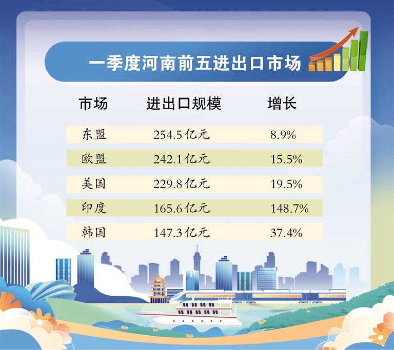 從進(jìn)出口市場(chǎng)看,東盟、歐盟、美國(guó)、印度、韓國(guó)是河南前五大貿(mào)易伙伴。河南對(duì)共建“一帶一路”國(guó)家和RCEP成員國(guó)進(jìn)出口快速增長(zhǎng)。