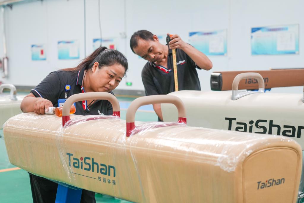 2024年7月8日,在山東泰山器材有限公司生產(chǎn)車間,工人在檢測(cè)剛下線的鞍馬。新華社記者 朱崢 攝