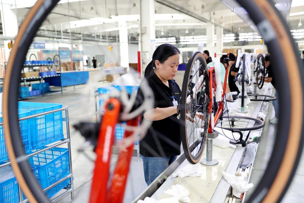 2023年9月9日,在山東樂(lè)陵市一家企業(yè)的碳纖維自行車生產(chǎn)車間,工人在組裝自行車。新華社發(fā)(張進(jìn)剛攝)
