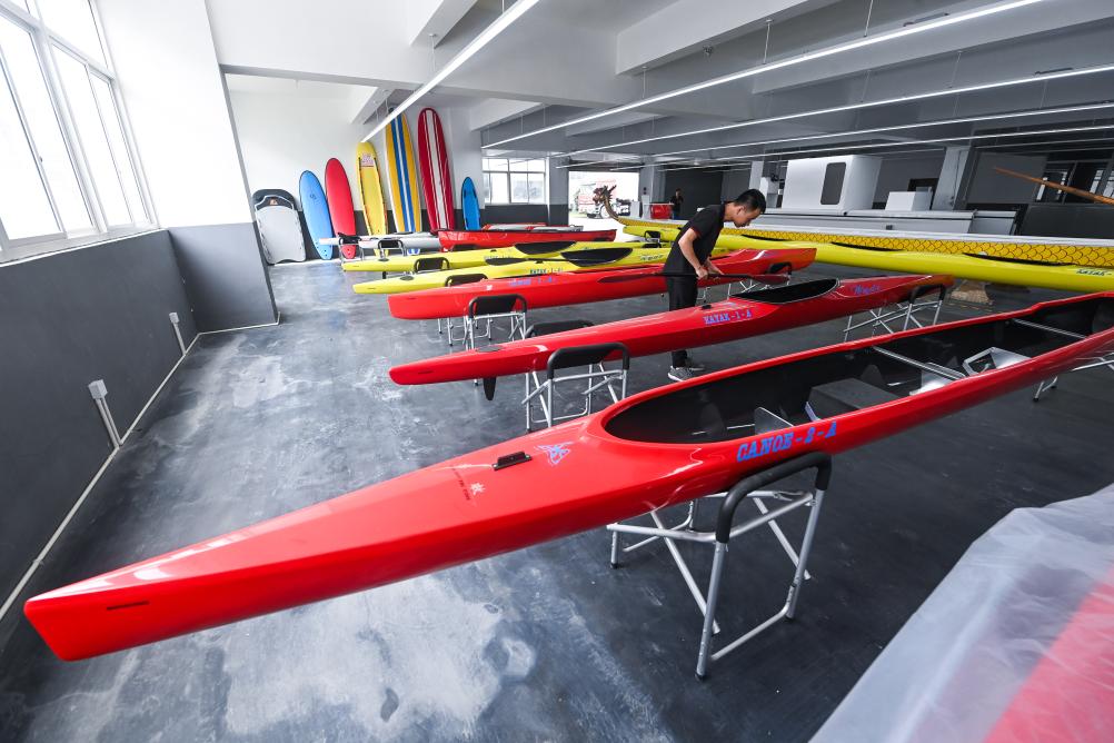 2023年7月18日,在位于杭州富陽(yáng)的杭州飛鷹船艇有限公司車間內(nèi),工人在檢查一批剛完工的皮劃艇。新華社記者 徐昱 攝