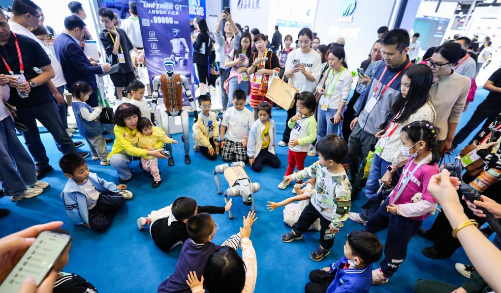 4月13日,在第五屆消博會現(xiàn)場,小朋友和宇樹科技展示的機器狗互動。新華社記者 楊冠宇 攝
