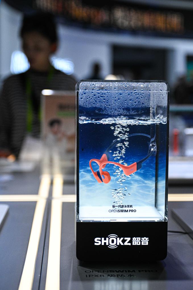 第五屆消博會韶音展臺上的新一代游泳耳機。新華社記者 蒲曉旭 攝