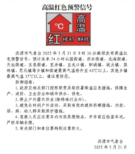 濟(jì)源市氣象臺繼續(xù)發(fā)布高溫紅色預(yù)警信號
