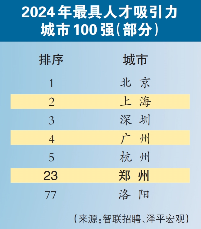 近日,“2024年最具人才吸引力城市100強(qiáng)”榜單出爐,河南鄭州、洛陽上榜,分別居第23名、77名。與往年相比,鄭州排名上升5位,洛陽排名未發(fā)生變化。